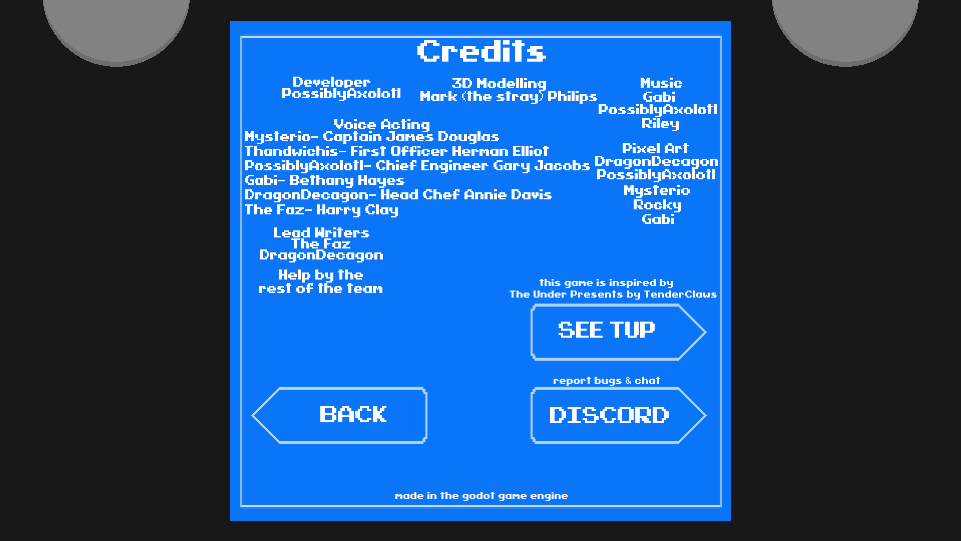The Under Presents: (boat name here), or as it will be referred to as, TUPF, was a fangame for The Under Presents by Tender Claws developed by PossiblyAxolotl and worked on by many members of the game's community in 2020.